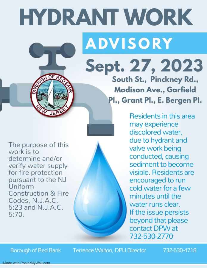Residents in the area of South Street, Pinckney Road, Madison Ave., Garfield Pl., Grant Pl., E. Bergen Pl. - may be experiencing discolored water. This is due to hydrant and valve work being performed in the area which causes sediment to become visible in the water. Residents who see discoloration should run their water through all faucets for five to ten minutes until it runs clear. If the issue persists beyond that, please contact DPW at (732)530-2770.