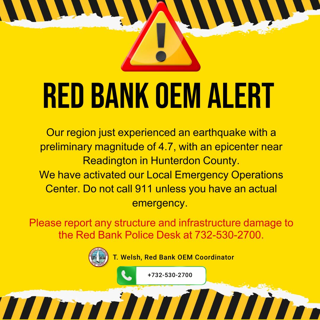 RED BANK OEM ALERT - Our region just experienced an earthquake with a preliminary magnitude of 4.7. Please report any structure and infrastructure damage to the Red Bank Police Desk at 732-530-2700.