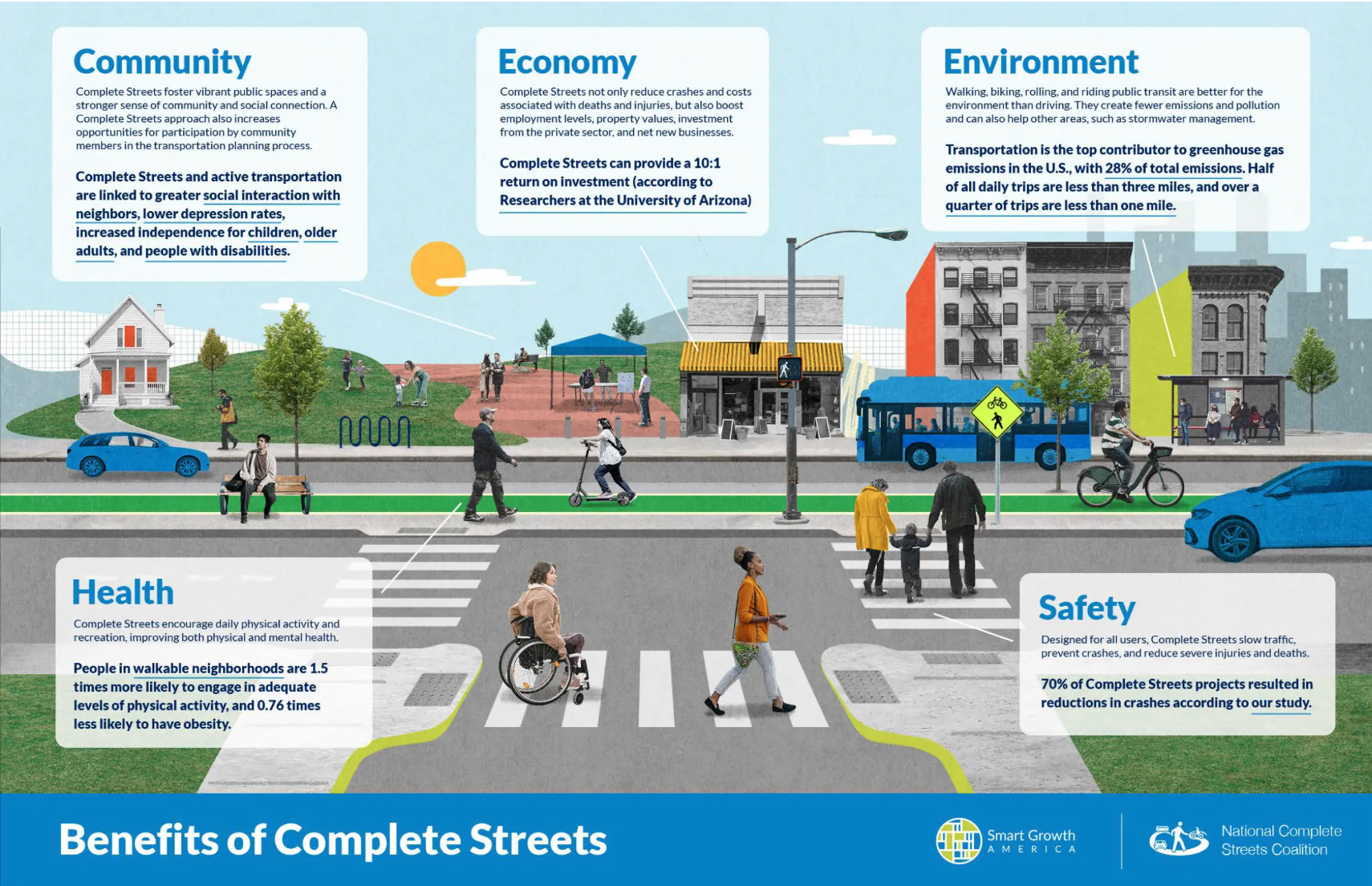 In addition to promoting safer and more inclusive mobility, Smart Growth America emphasizes that Complete Streets policies can lead to broader economic benefits, increased community connectivity, and a reduction in transportation-related emissions.